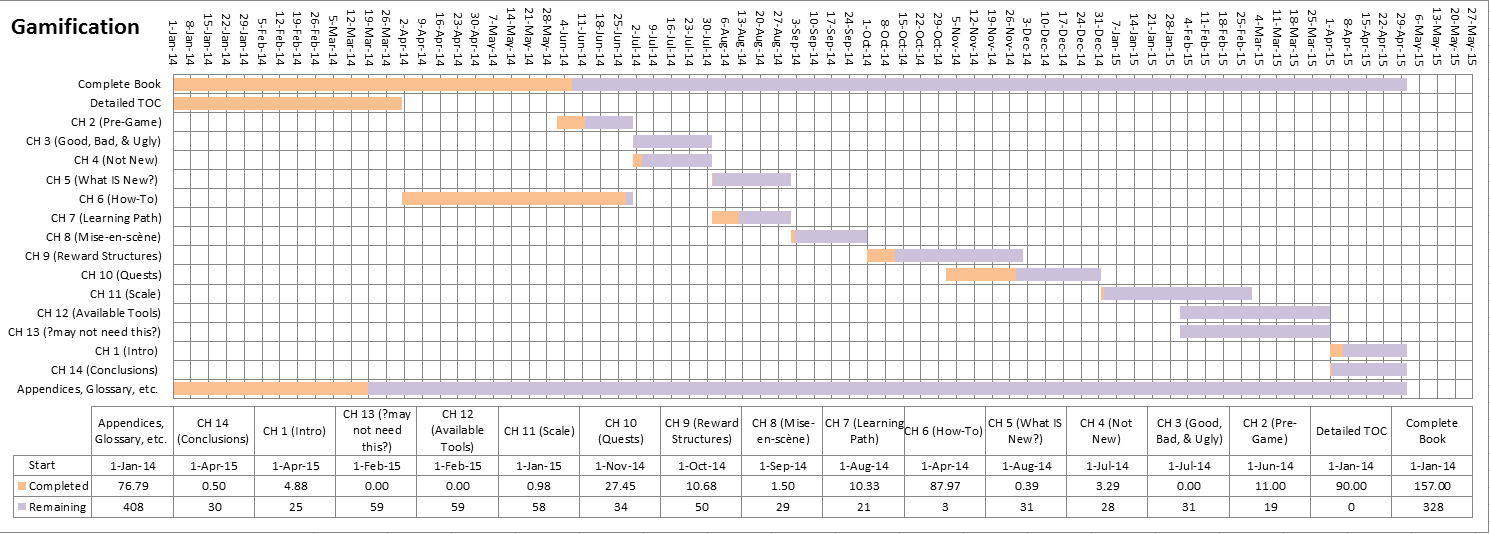 Note: the colors indicate what portion is complete, except for the first entry, which shows the date of the timeline.